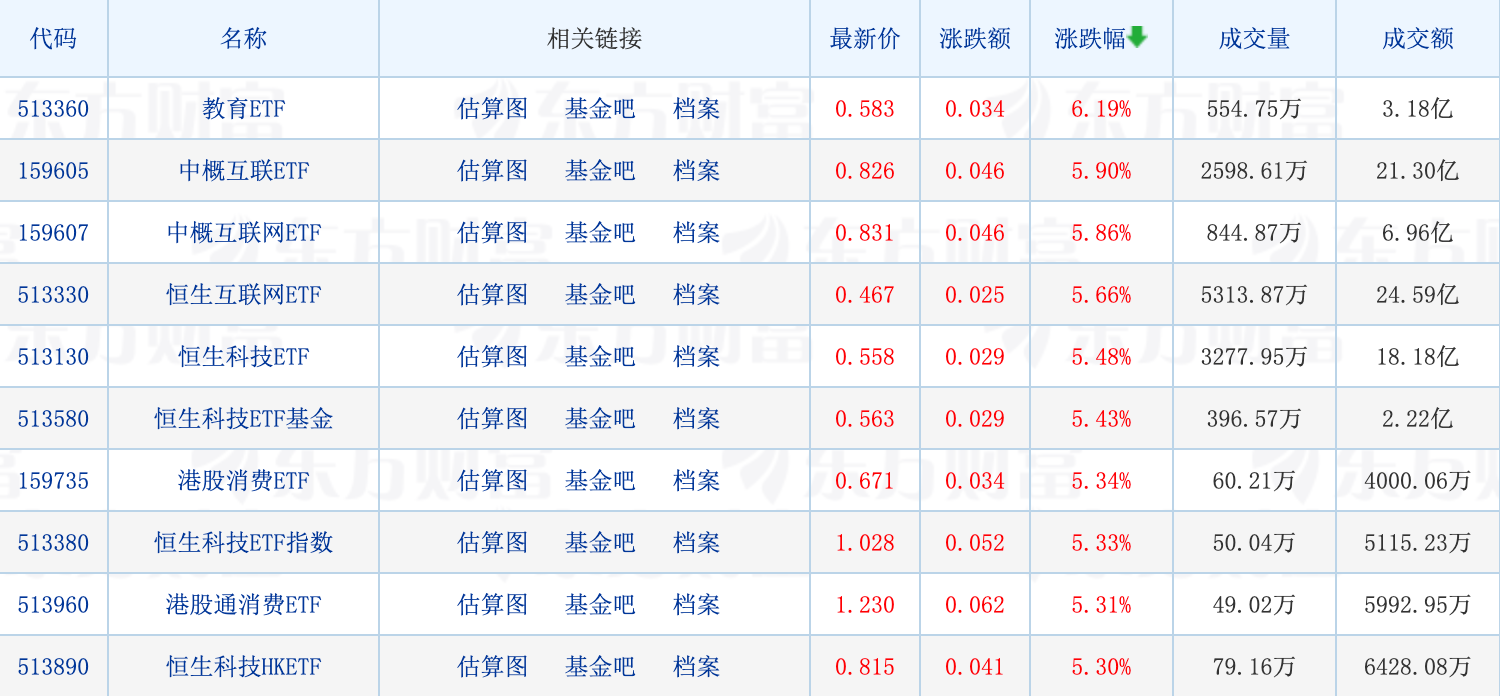 此外,港股方面,恒生科技指数表现强势,截至发稿,涨4.05%。多只中概互联相关ETF霸榜,涨幅均在5%以上。