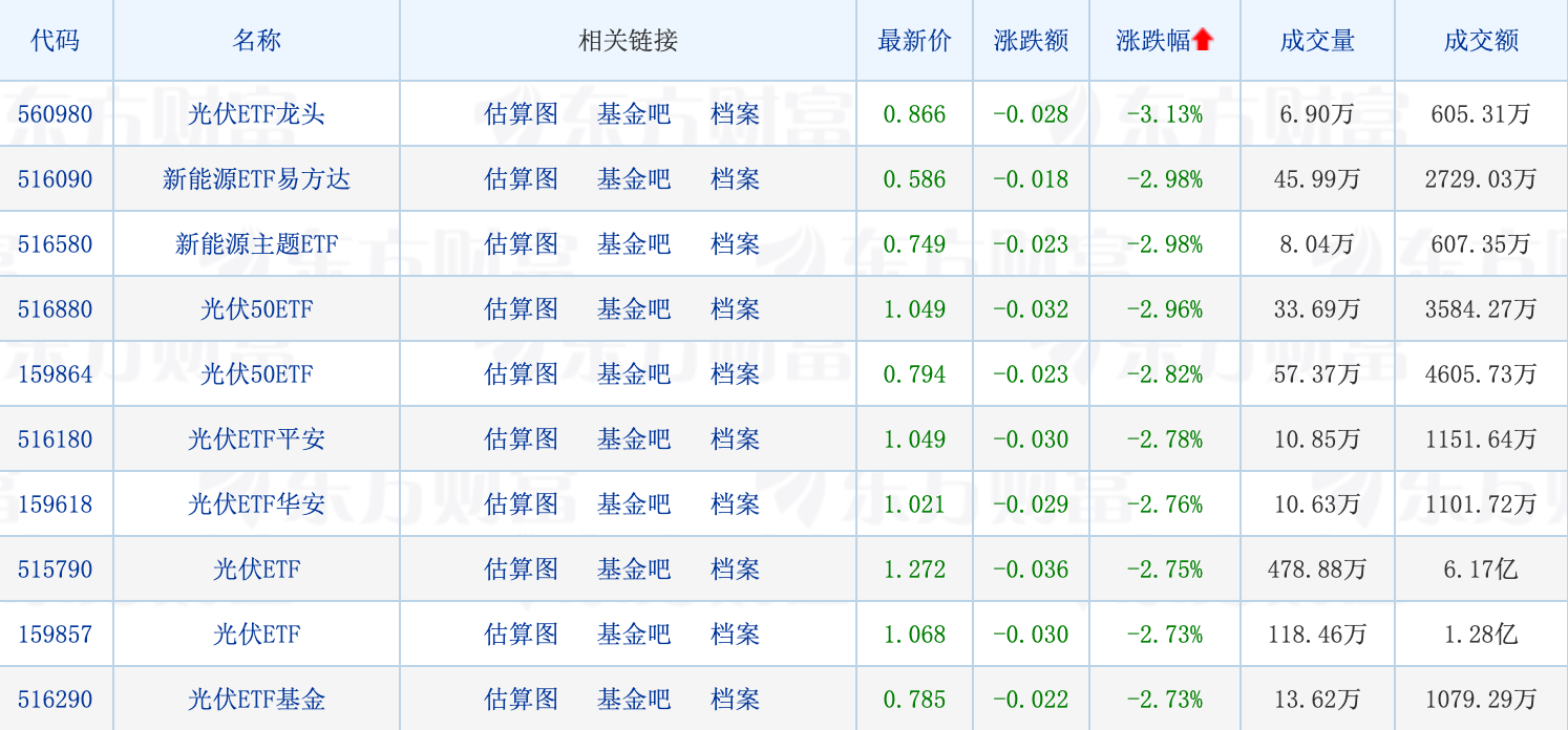下跌方面,光伏等赛道股今日继续调整,光伏设备板块指数下挫2.93%,三孚新科20CM跌停,沐邦高科、东方盛虹跌超9%。受此影响,光伏相关ETF继续刷屏跌幅榜。
