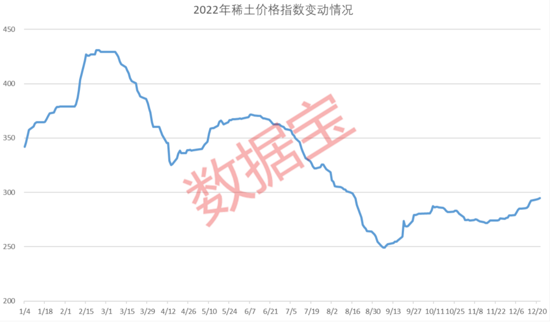 9月初期,稀土价格指数触及年内低点249,随后震荡盘升。截至12月22日,最新稀土价格指数为294.8,累计上涨18.39%。早前中国稀土行业协会数据显示,2月末期稀土价格指数冲至431,创下历史新高。