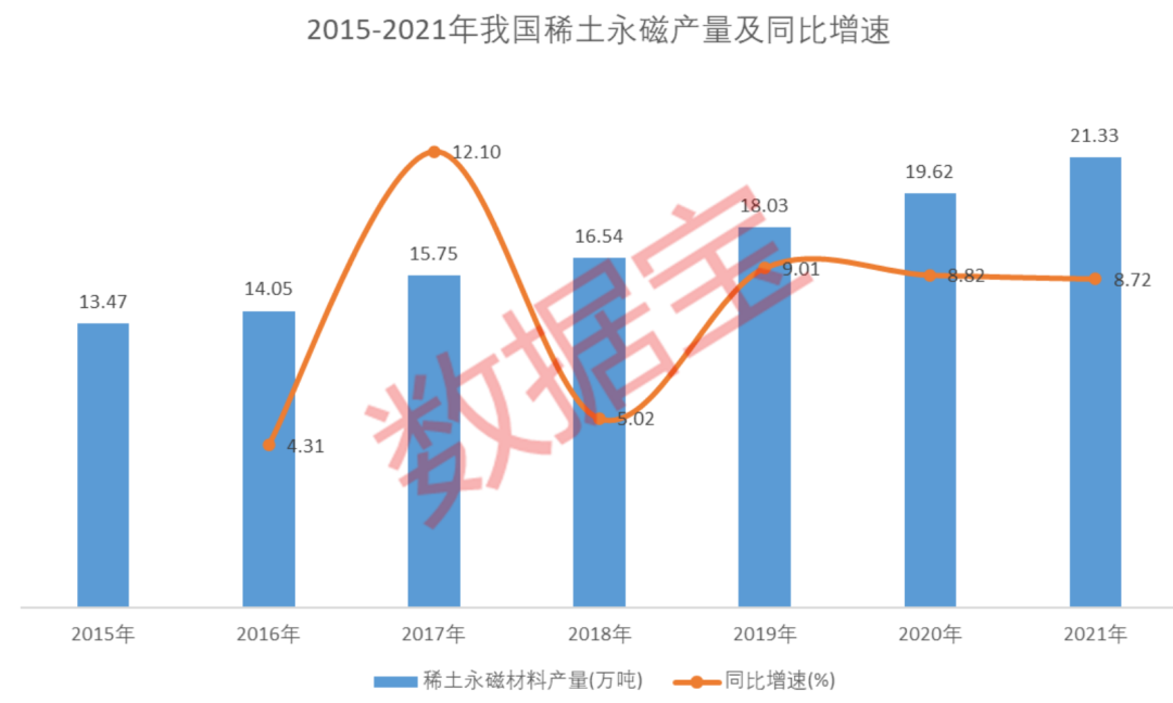 我国稀土永磁材料产量逐年递增并位居世界第一,是国际市场上最主要的生产国之一。数据显示,我国稀土永磁材料产量从2015年的13.47万吨增长至2021年的21.33万吨,年复合增长率7.96%。