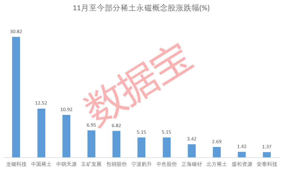 今年以来,稀土永磁指数随大盘宽幅震荡,近期更是五连跌。证券时报·数据宝统计,11月以来,指数横盘震荡,累计收涨0.11%。概念股中,龙磁科技累计涨幅居首,高达30.82%;其后中国稀土、中钢天源两股涨幅超过10%。