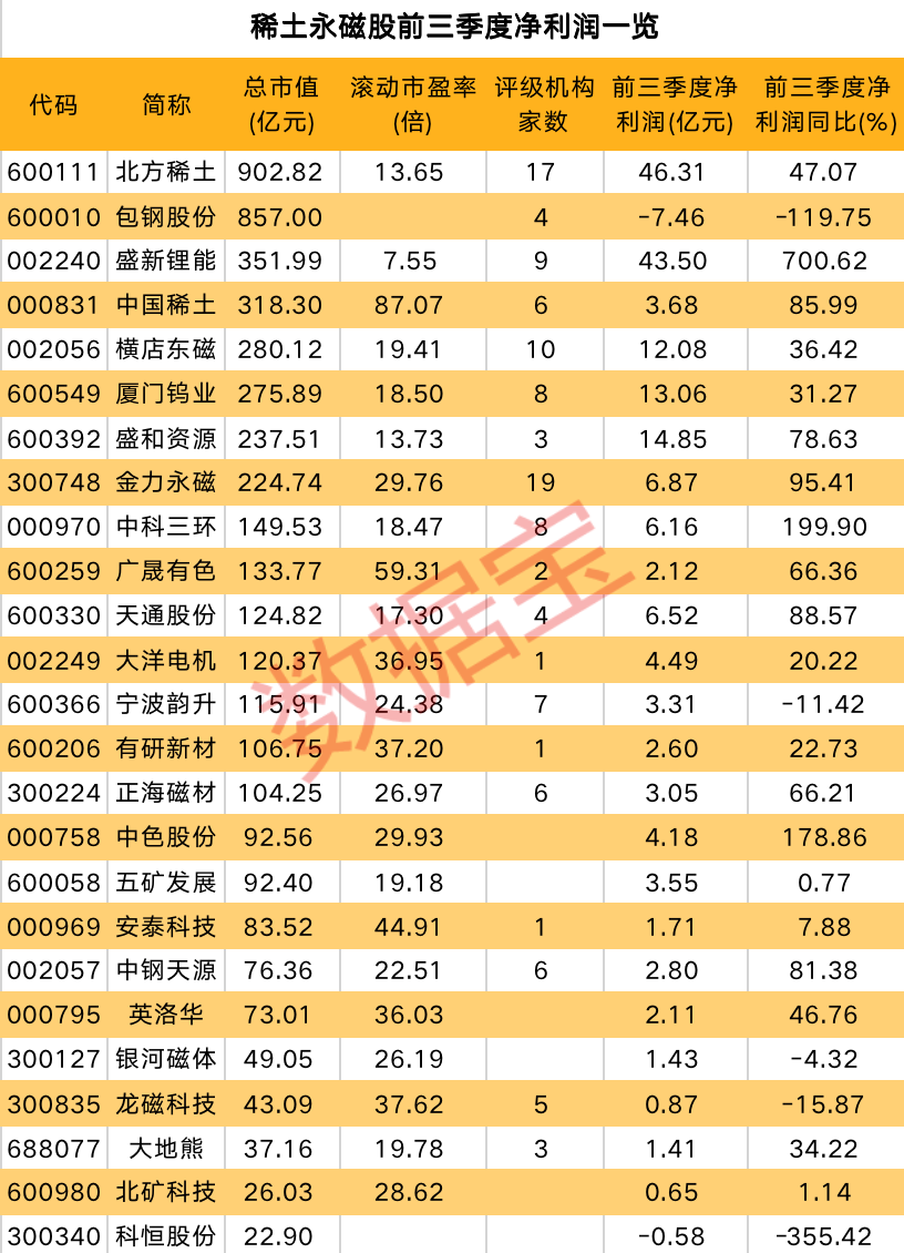前三季度,上游稀土供应商与下游磁材企业均有不错的业绩表现。稀土龙头北方稀土实现净利润46.31亿元,同比增长47.07%;中国稀土净利润3.68亿元,同比增长85.99%。下游磁材企业中,龙头横店东磁净利润12.08亿元,同比增长36.42%;金力永磁净利润6.87亿元,同比增长95.41%。此外,盛新锂能、中科三环、中色股份等股净利润表现也较为出色。