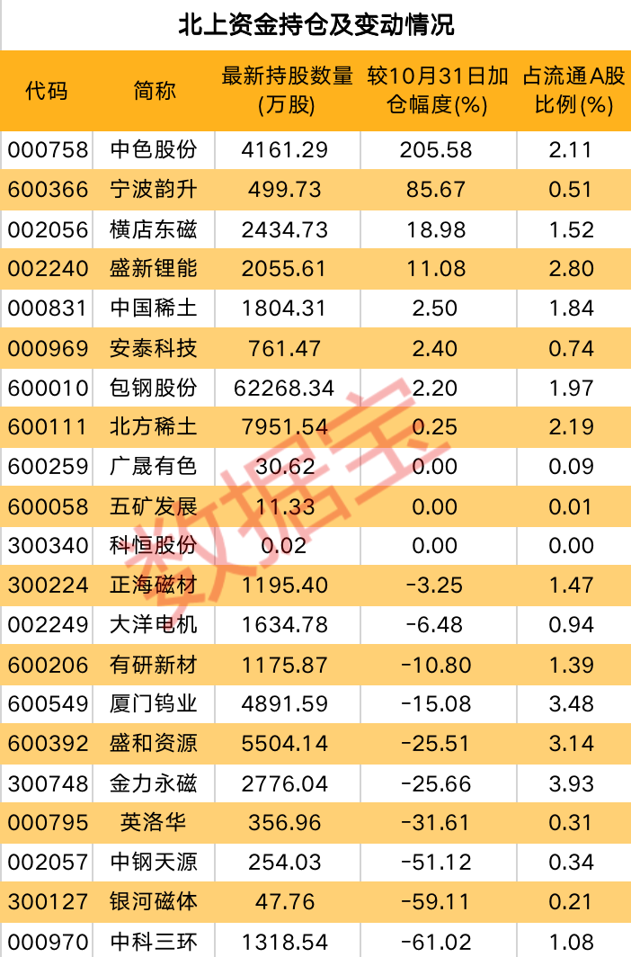 自10月末以来,多只稀土资源股获北上资金加仓。北上资金对中色股份加仓幅度居首,最新持仓较10月末增长205.58%;宁波韵升次之,增持力度为85.67%;另有横店东磁和盛新锂能加仓幅度超过10%,对中国稀土和北方稀土也均有不同程度的增持。不少磁材企业则遭到北上资金减持,中钢天源、银河磁体、中科三环等股减仓幅度在50%以上。