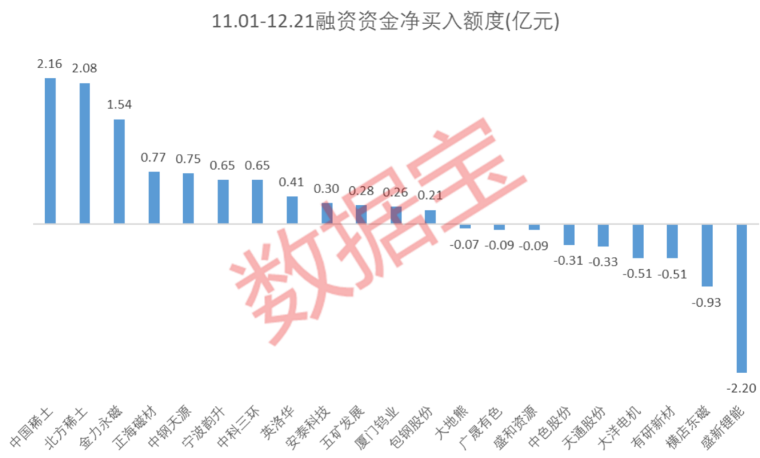 与此同时,融资资金也看好稀土永磁。截至12月21日,融资资金净买入两大稀土龙头中国稀土2.16亿元、北方稀土2.08亿元。下游磁材企业同样获得融资资金注入,其中金力永磁获得融资净买入1.54亿元;正海磁材和中钢天源分别为0.77亿元、0.75亿元。