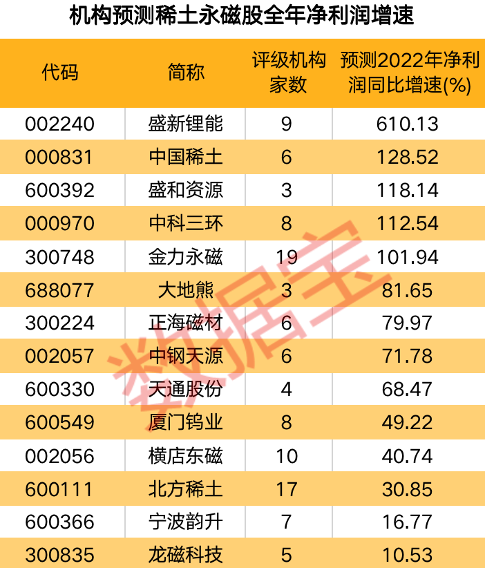 数据宝统计,根据3家及以上机构一致预测,5只稀土永磁概念股全年净利润有望翻倍。盛新锂能净利润增速居首,高达610.13%,其稀土产品主要应用于永磁材料、催化剂、硬质合金等领域。公司近期引入比亚迪作为战投,后者全额认购4663.09万股股票,一跃成为公司第三大股东,持股比例5.11%。此外,中国稀土、盛和资源、中科三环、金力永磁等4股净利润增速超过100%;2021全年净利润行业居首的北方稀土预计今年继续增长30.85%。