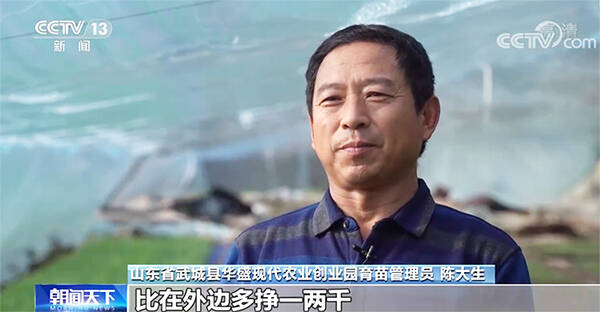 德州市武城县华盛现代农业创业园育苗管理员陈大生说:”一个月五六千块钱,比在外边多挣一两千,离家挺方便,也能照顾家里。“