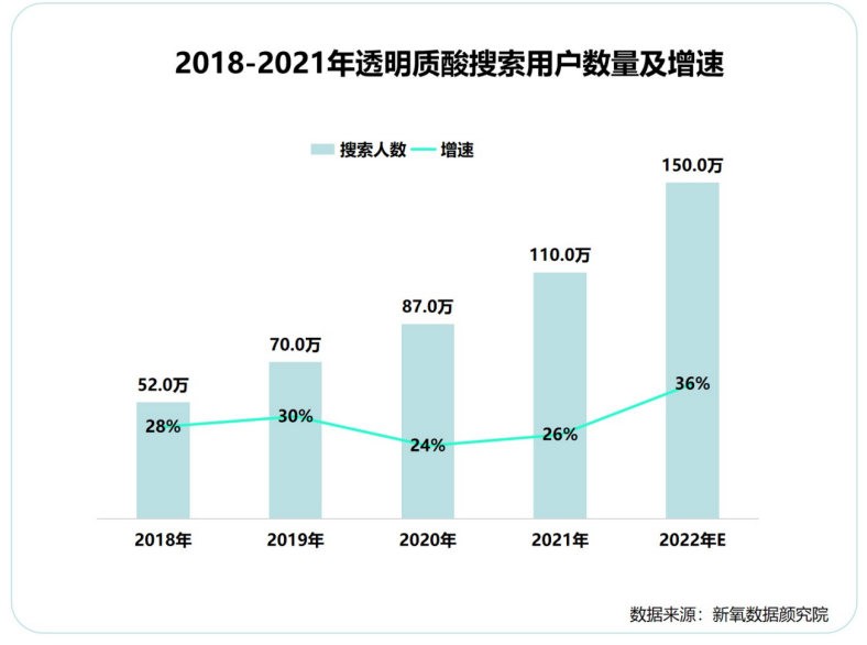 数据证明,中国透明质酸消费人群增量可观,关注度不断攀升。报告指出,2021年透明质酸关注用户突破110万,2022年则达到150万。5年间其增速保持在24% - 36%之间。这意味着,得益于轻医美市场崛起及透明质酸市场教育成熟,透明质酸“人气指数”仍然处于爬坡期,而逐年攀升的用户体量有望带来市场新增量,将赋予透明质酸市场更广阔成长空间。