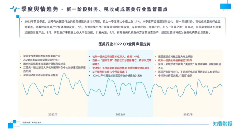 近年来,医美行业呈监管不断趋严、行业负面舆情不断发酵升级态势。根据搜扬美商研究院与知微数据联合分析发现:2022年第三季度,全网有关医美行业的相关报道共计137万篇,较上一季度环比小幅上涨1.7%。