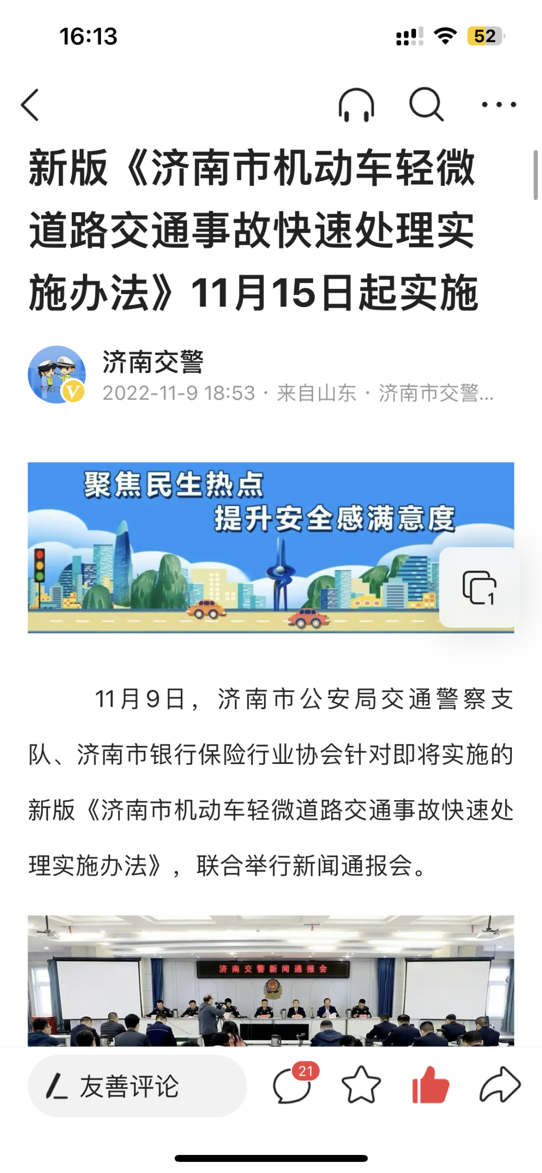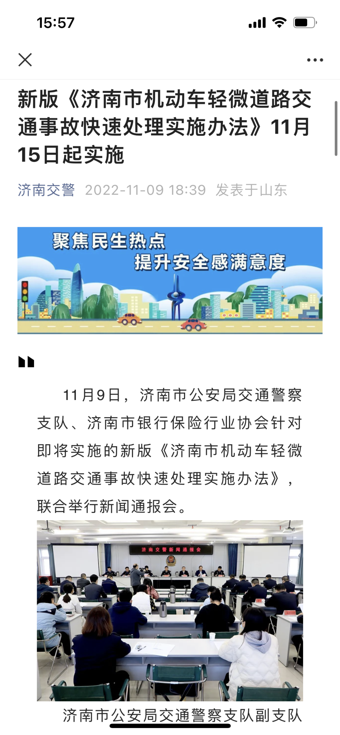 自11月15日新版《济南市机动车轻微道路交通事故快速处理实施办法》实施以来,快处快赔工作取得了阶段性成效。