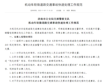 为规范机动车轻微道路交通事故快速处理工作,明确轻微事故接处警职责,提高道路通行效率,事故处制定并下发《济南市公安局交通警察支队机动车轻微道路交通事故快速处理工作规范》,详尽地对发生轻微道路交通事故后“当事人报警的情形”、“工作中发现的情形”、“交管12123后台审核”及“未规定的情形”进行了具体规定。