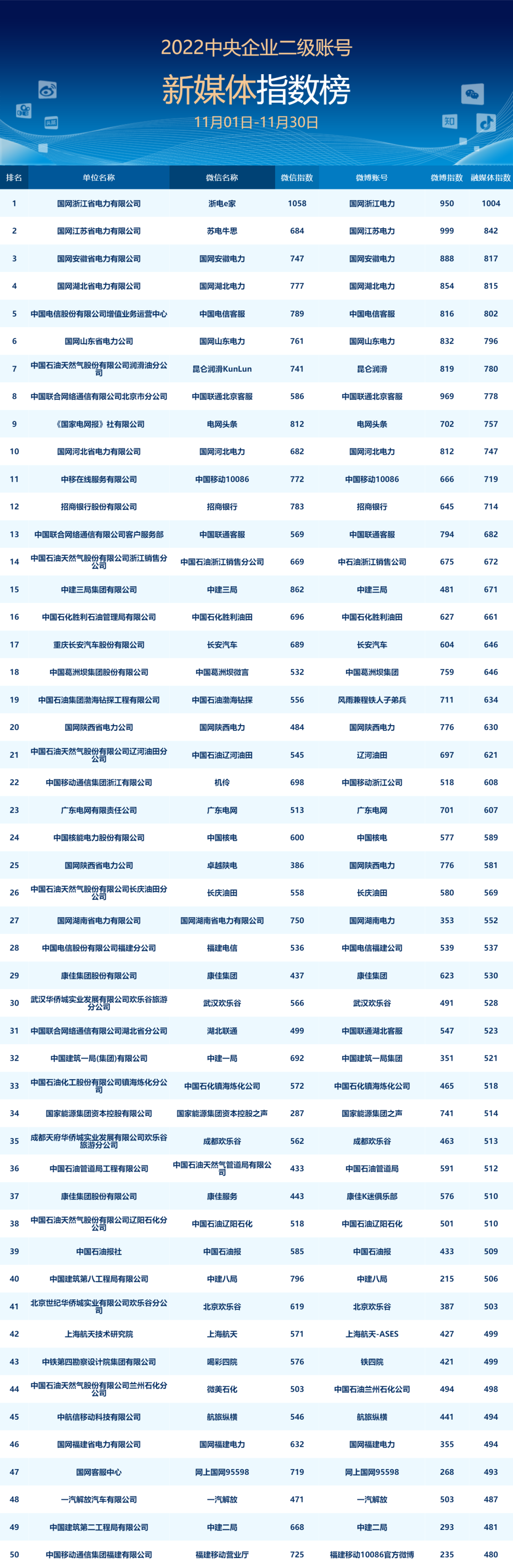 从2014年起,国资委新闻中心(@国资小新)联合清华大学新闻研究中心、清博指数、中国企业联合会、中国经济网、《中国企业家》杂志发布“央企二级账号新媒体指数榜”,由以往单一新媒体平台评估升级为融合微信、微博双平台的综合评价指标体系,收集、分析了2022年11月1日-11月30日期间600多个中央企业二级新媒体账号的基础数据,对企业微信、微博运营的实际绩效和影响力进行专业性考量。