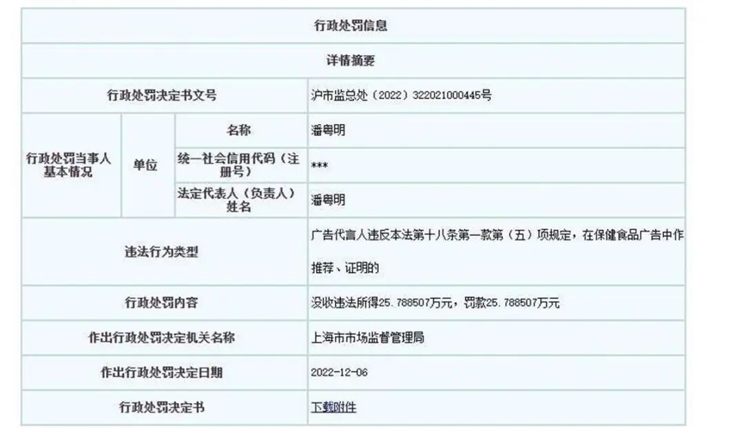 12月25日,南都记者注意到,近日,上海市市场监督管理局发布的行政处罚决定书显示,演员潘粤明代言违法保健品广告,被没收违法所得约25.8万元,罚款约25.8万元。