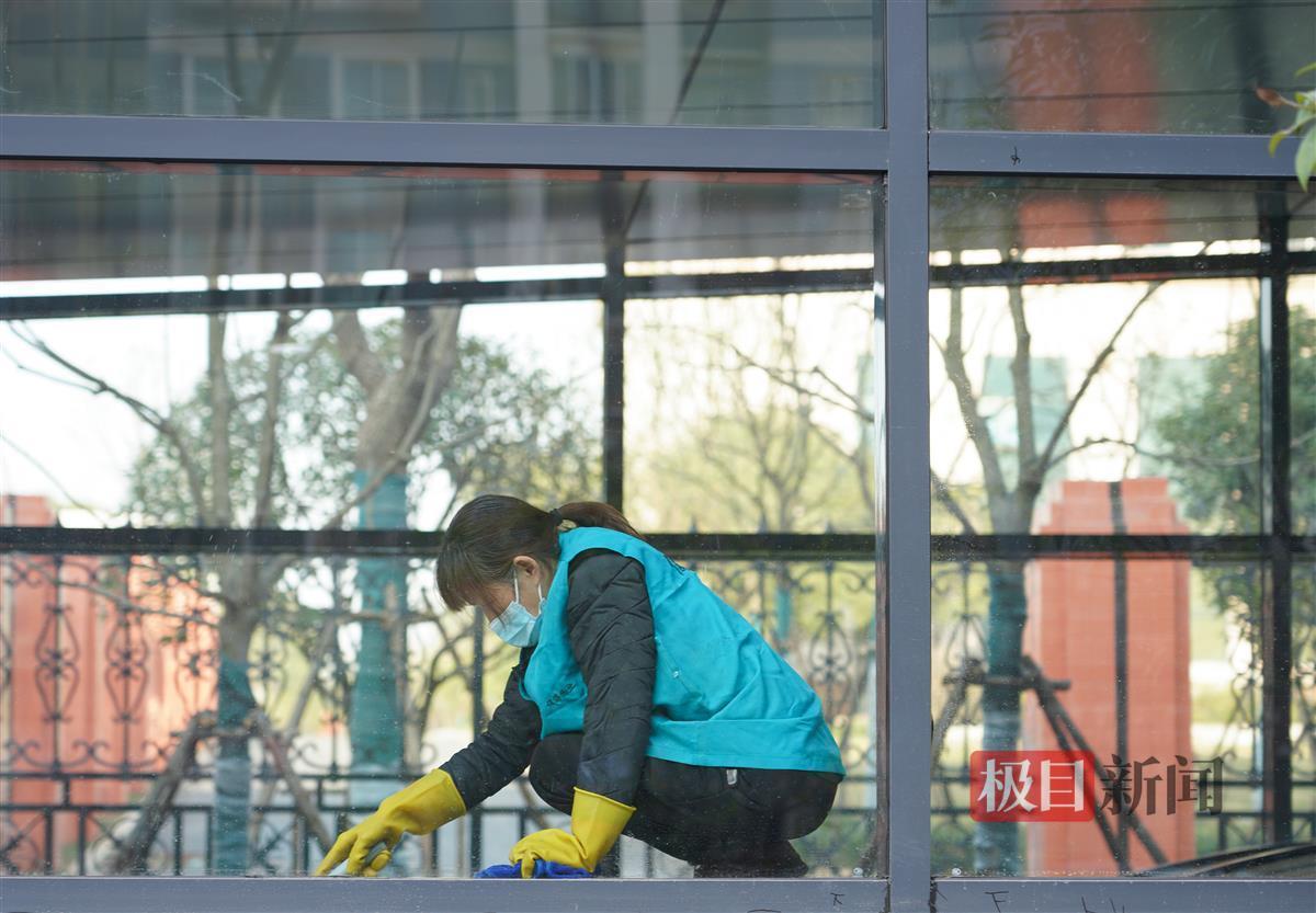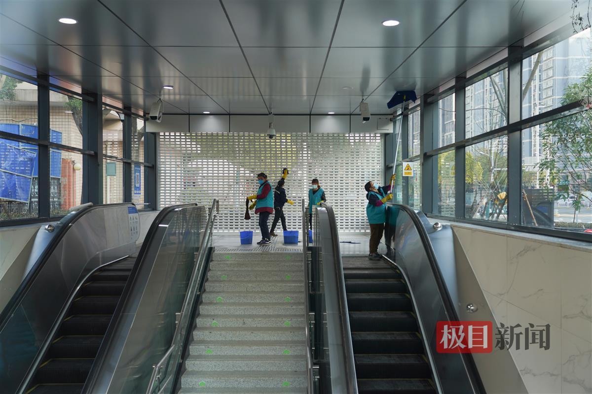 12月23日,轨道交通7号线北延线巨龙大道站F口,工人在做精细保洁。轨道交通7号线北延线从横店站至7号线一期工程园博园北站(不含),全长约21.12公里。据了解,武汉市今年内将新增两条地铁,分别是轨道交通7号线北延线(前川线)一期和16号线(汉南线)。