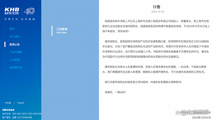 12月25日,体外诊断上市公司科华生物通过官网发布讣告:公司创始人、原董事长,原上海市生物医药行业协会副会长唐伟国,因感染新型冠状病毒伴发基础性疾病,于2022年12月25日在上海不幸逝世,享年66岁。