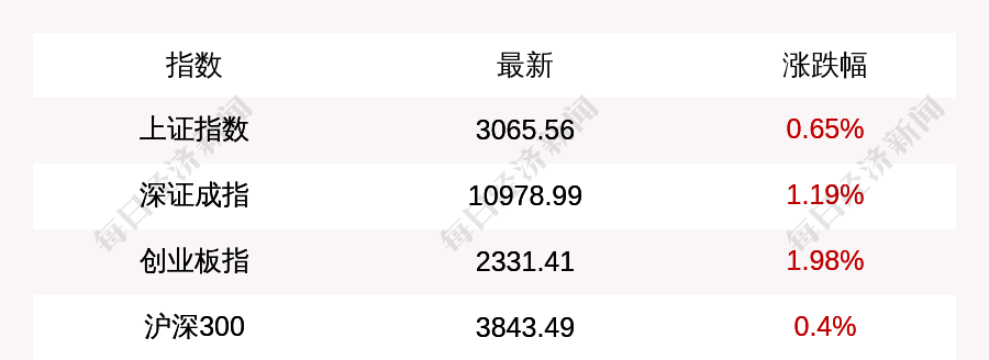 北京时间12月26日15:00,上证指数收盘上涨19.69点,涨幅为0.65%,报收3065.56点,成交额2554.7亿元;深证成指收盘上涨129.35点,涨幅为1.19%,报收10978.99点,成交额3688.06亿元;创业板指收盘上涨45.22点,涨幅为1.98%,报收2331.41点,成交额1199.92亿元;沪深300收盘上涨15.27点,涨幅为0.4%,报收3843.49点,成交额1486.93亿元。