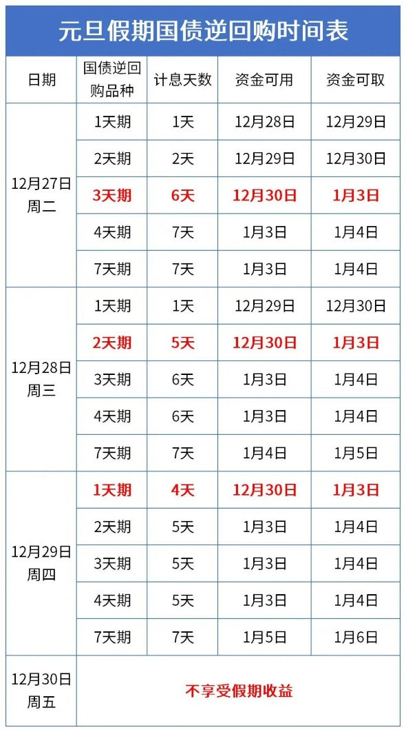 单从计息时间来看,目前元旦国债逆回购最佳操作日期是周四(12月29日)。操作1天期逆回购(可在当日盘中及收盘后的半小时内下单,资金在次一交易日盘前已可用)能赚足4天利息。