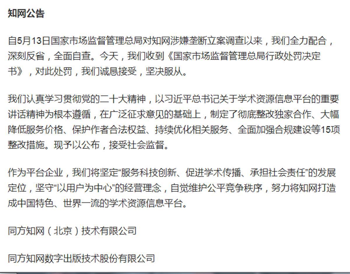 另据媒体报道,知网滥用市场支配地位被罚8760万元后,立即发布了5个方面共15项整改措施的方案,包括:彻底整改与期刊、高校的独家合作;大幅降低数据库服务价格;保护作者合法权益;持续优化相关服务;全面加强合规建设等。