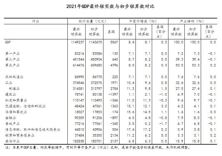 经最终核实,2021年,GDP现价总量为1149237亿元,比初步核算数增加了5567亿元;按不变价格计算,比上年增长8.4%,比初步核算数提高0.3个百分点。
