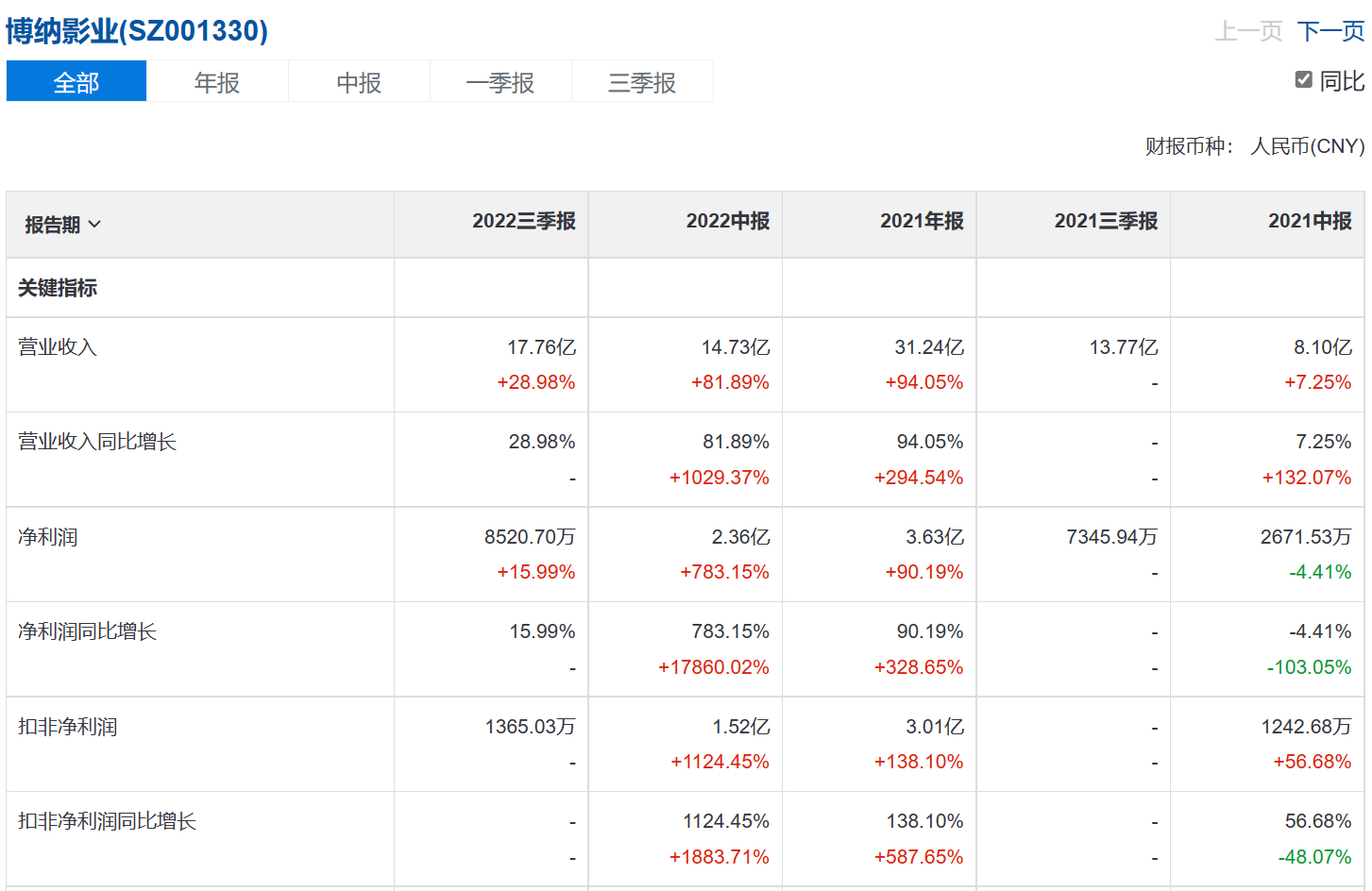 10月30日,博纳影业发布了2022年三季度业绩报告。三季报显示,公司前三季度实现营收17.76亿元,同比增长28.98%;实现净利润8520.70万元,同比增长15.99%。