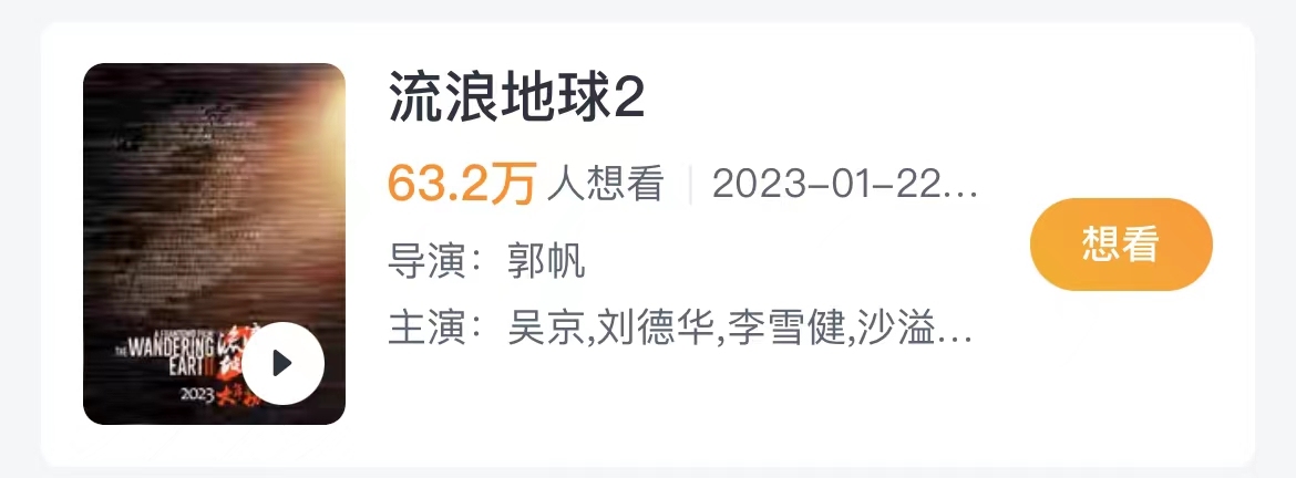 淘票票的新片想看榜上,《流浪地球2》已有63.2万人“想看”。