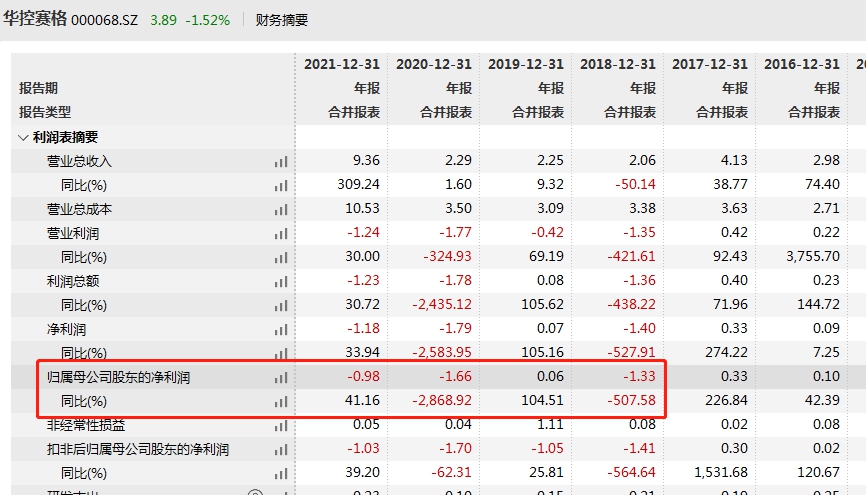 据财报,华控赛格近年来业绩不佳。2018年至2021年净利润分别为:-1.33亿元、0.06亿元、-1.66亿元和-0.98亿元。2022年前三季度,公司实现营收8.52亿元,同比增加48.32%;净亏损3992.21万元。(中新经纬APP)