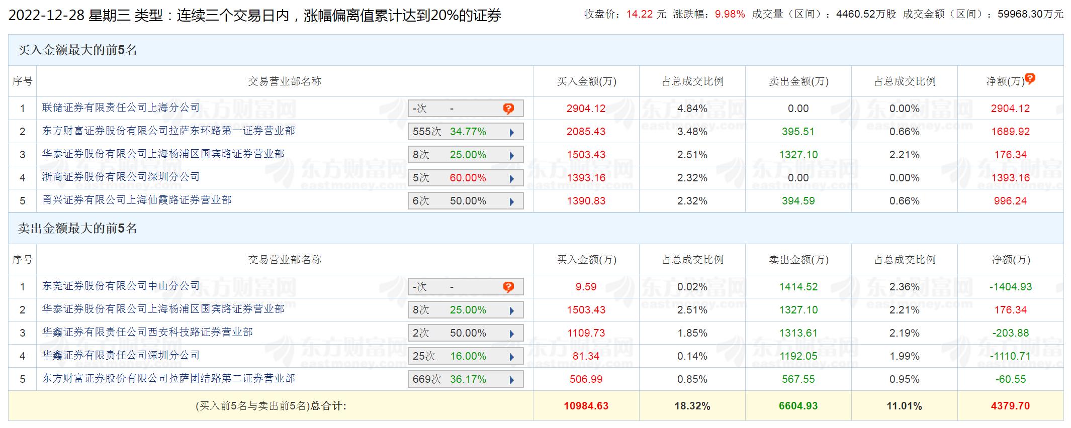 联储证券上海分公司、东方财富证券拉萨东环路第一证券营业部分别买入2904.12万元、2085.43万元。东莞证券中山分公司、华泰证券上海杨浦区国宾路证券营业部分别卖出1414.52万元、1327.10万元。(中新经纬APP)
