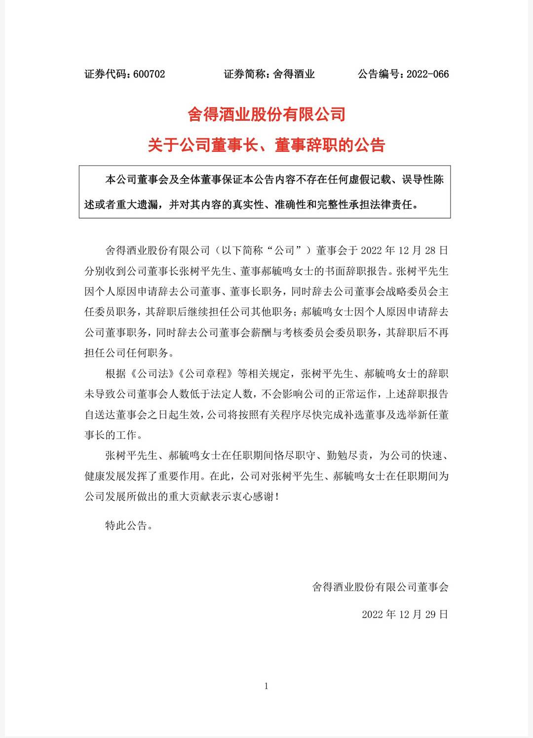舍得酒业28日晚间发布公告称,舍得酒业股份有限公司董事会12月28日分别收到公司董事长张树平、董事郝毓鸣的书面辞职报告。张树平因个人原因申请辞去公司董事、董事长职务,同时辞去公司董事会战略委员会主任委员职务,其辞职后继续担任公司其他职务;郝毓鸣因个人原因申请辞去公司董事职务,同时辞去公司董事会薪酬与考核委员会委员职务,其辞职后不再担任公司任何职务。