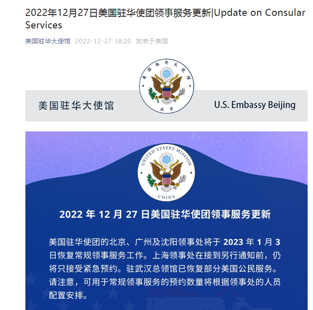 27日晚,美国驻华大使馆微信公众号发布消息称,美驻华使团的北京、广州及沈阳领事处将于2023年1月3日恢复常规领事服务工作。