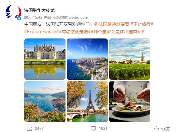 27日下午,法国驻华大使馆官方微博更新动态,欢迎中国游客前往法国旅游,表示“中国朋友,法国张开双臂欢迎你们!”