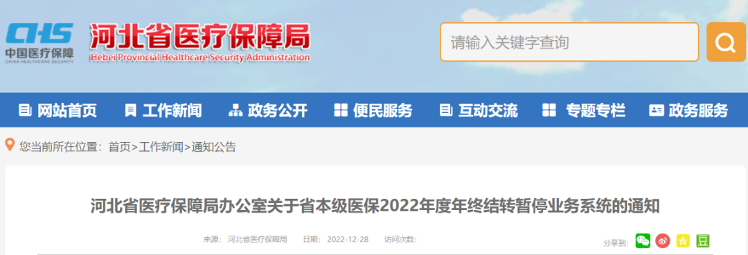 河北省医疗保障局办公室最新发布关于省本级医保2022年度年终结转暂停业务系统的通知
