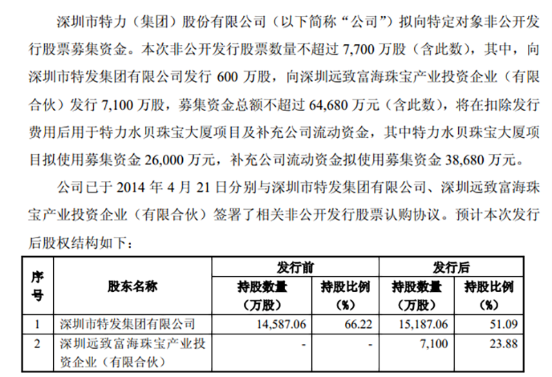 公告也毫不讳言,远致富海(公告中亦简称为“珠宝产业基金”)成立的目的就是为了参与特力A的增发。