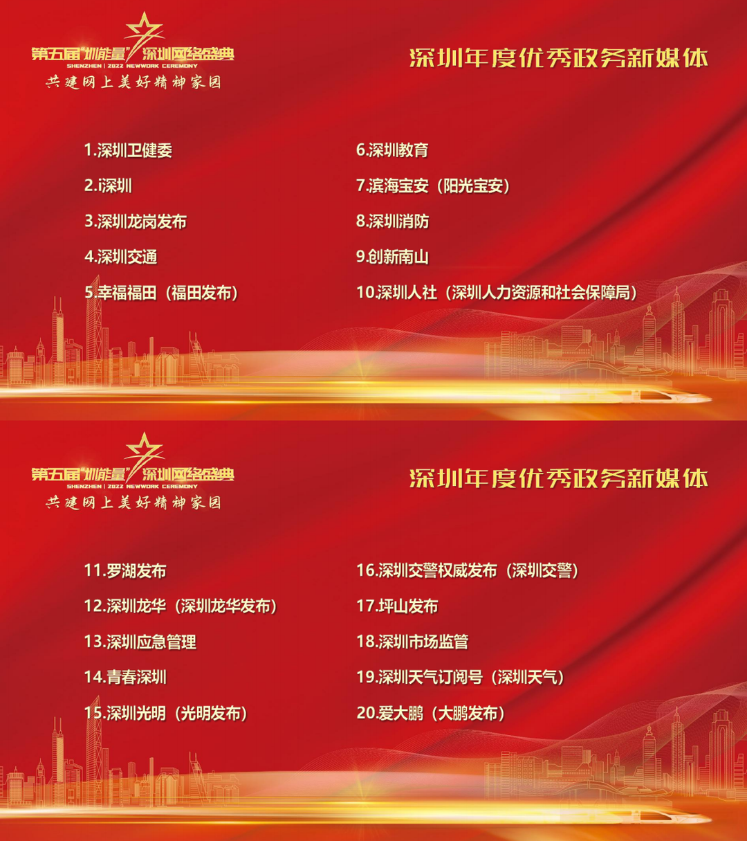 2022年深圳年度优秀政务新媒体榜单在第五届“圳能量”深圳网络盛典上正式出炉,深圳卫健委、i深圳、深圳龙岗发布等二十个政务新媒体入列。