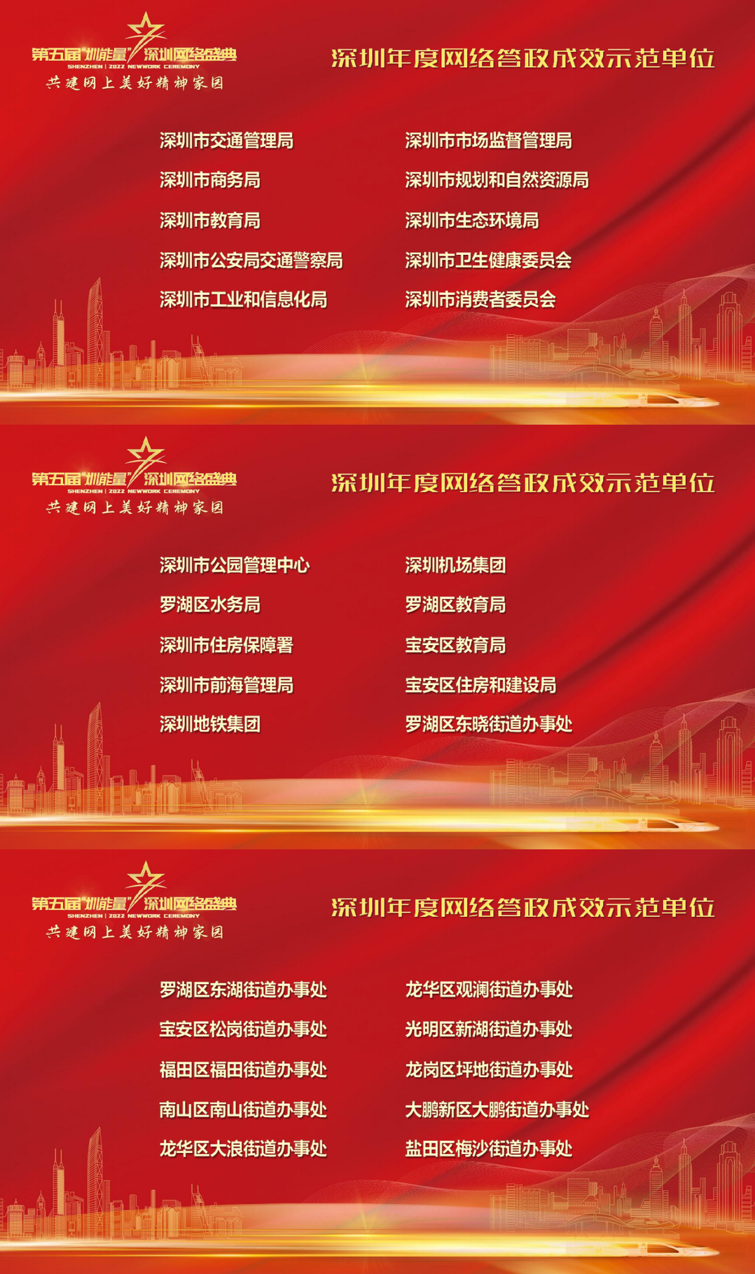 本届盛典还评选出“2022年度深圳网络答政成效示范单位”。据深圳舆情研究院负责人表示,深圳作为中国特色社会主义先行示范区和最具互联网气质的城市,早就认识到听取网络民意,回应网络民声的必要性和重要性,深圳舆情研究院从信息发布、网络引导、答政效果等多个维度,对多个政府部门的全年答政工作情况进行综合考量,最终确定30个“2022年度深圳网络答政成效示范单位”名单。