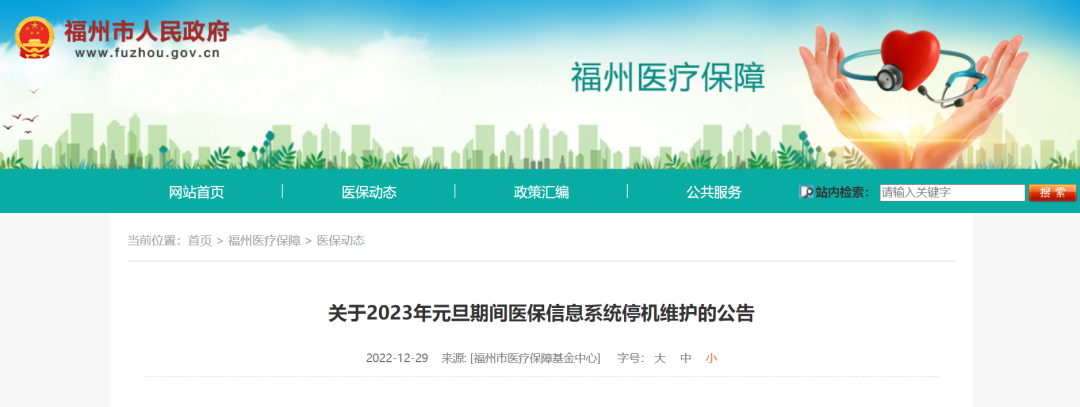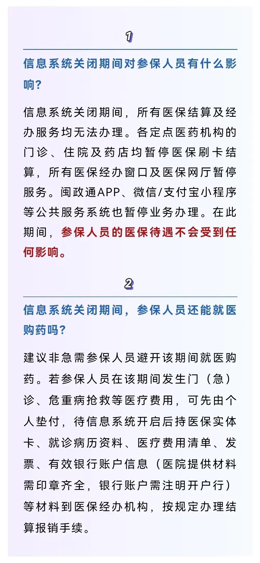 按照省级医保部门统一部署安排,为做好2022—2023年度医疗费用清算、个人账户计息、城乡医疗救助政策调整及信息系统升级等项工作,福建省医保信息系统将于2023年元旦期间关闭升级维护。