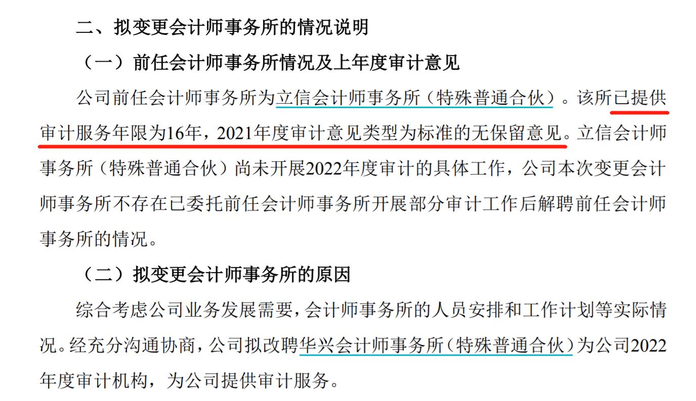 据介绍,立信会计师事务所已提供审计服务年限为16年,2021年度审计意见类型为标准的无保留意见。目前,立信会计师事务所尚未开展2022年度审计的具体工作,本次变更会计师事务所不存在已委托前任会计师事务所开展部分审计工作后解聘前任会计师事务所的情况。