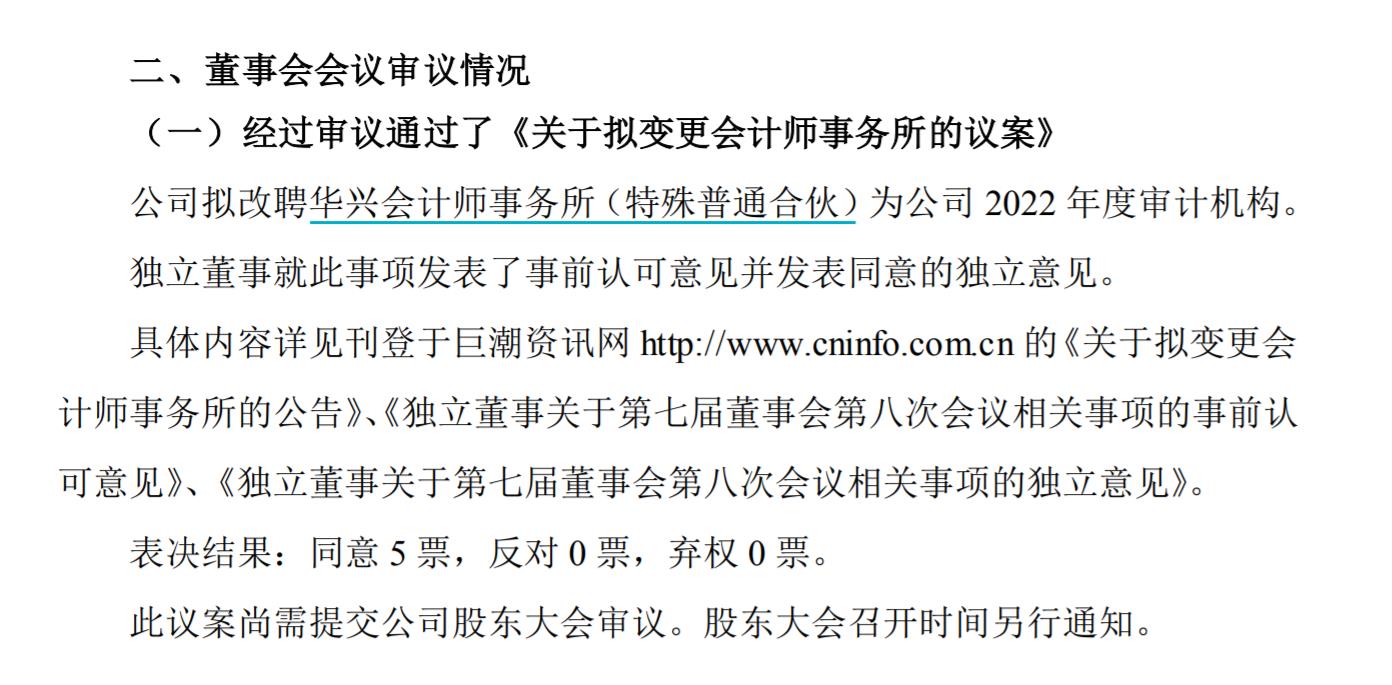 当天同时披露的第七届董事会第八次会议决议公告称,经过审议通过了《关于拟变更会计师事务所的议案》,同意5票,反对0票,弃权0票。