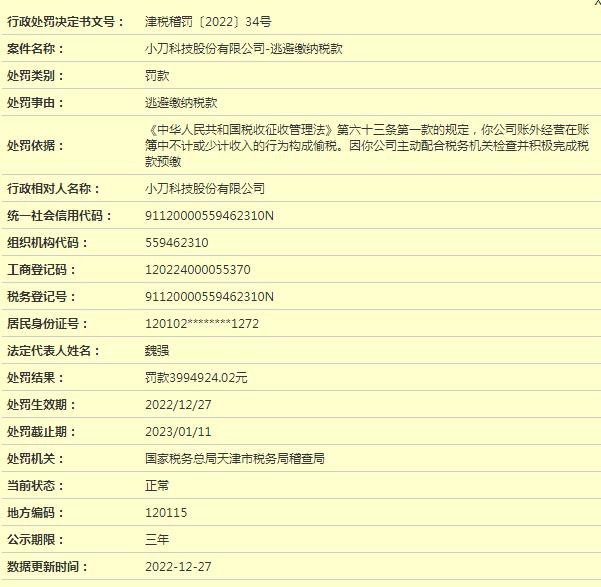 中新经纬12月29日电 因逃避缴纳税款,小刀科技股份有限公司被罚超399万元。
