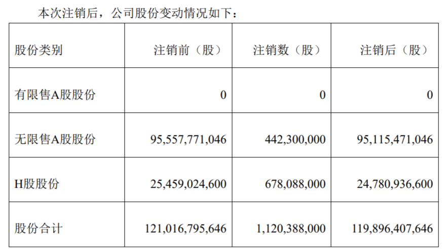 【大河财立方消息】12月29日,中国石化发布公告称,经公司申请,将于12月30日在中登公司上海分公司注销本次所回购的全部A股股份4.423亿股,并及时办理变更登记手续等相关事宜。截至公告日,公司共回购7.325亿股H股,其中,0.544亿股H股已于10月14日注销,6.78亿股H股已于12月29日注销。