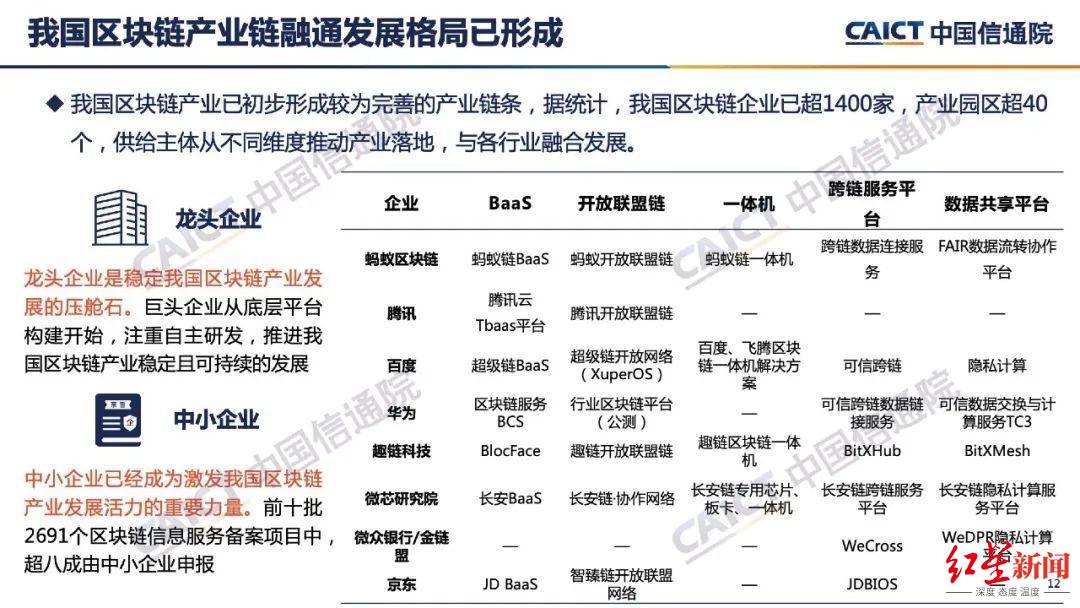 在产业方面,我国已初步形成较为完善的区块链产业链条,龙头企业的压舱石和中小企业动力源作用,共同推动产发展。据统计,我国区块链企业超过了1400家,产业园区超40个。