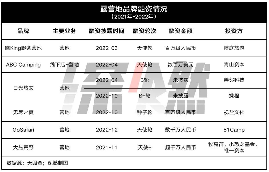 从一级市场的被投项目中也能看出一些共同点:多与露营地相关,公司成立时间短,融资轮次集中在天使轮。