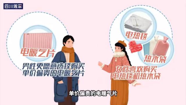 天冷,用点贴心的。四川人民在取暖用品上更倾向于购买电热毯、电暖气片、热水袋,2022年12月,电热毯、电暖气片、热水袋在四川地区的销量较去年同期上升380%、170%、220%,女性喜欢购买电热毯和热水袋,男性更愿意选择购买单价偏贵的电暖气片。