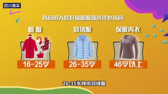 天冷,穿点暖和的。今年12月份(12月1日-12月20日)羽绒服、棉服在四川地区的销量比去年同期上升96%、120%。不同的人群对保暖服饰选择也不同,16-25岁更喜欢买棉服,26-35岁倾向羽绒服,46岁以上更爱保暖内衣。