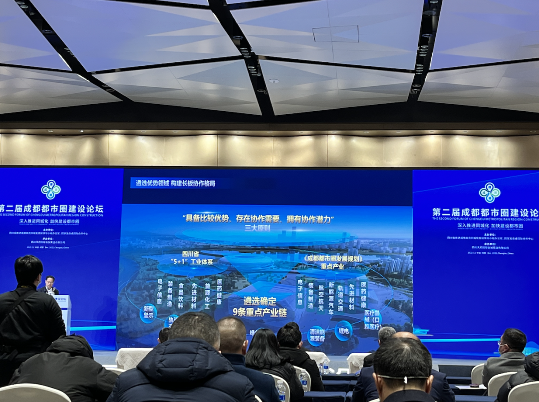 在本届论坛上,清华大学中国新型城镇化研究院院长助理、城市群与都市圈研究中心主任、清华同衡规划院副总规划师卢庆强发布了《现代化成都都市圈发展指数》,中国社会科学院生态文明研究所生态评价研究室副主任李学锋发布了《成都都市圈建设蓝皮书(2022)》,成德眉资4市经信部门有关同志发布了《成都都市圈重点产业产业全链全景图》。