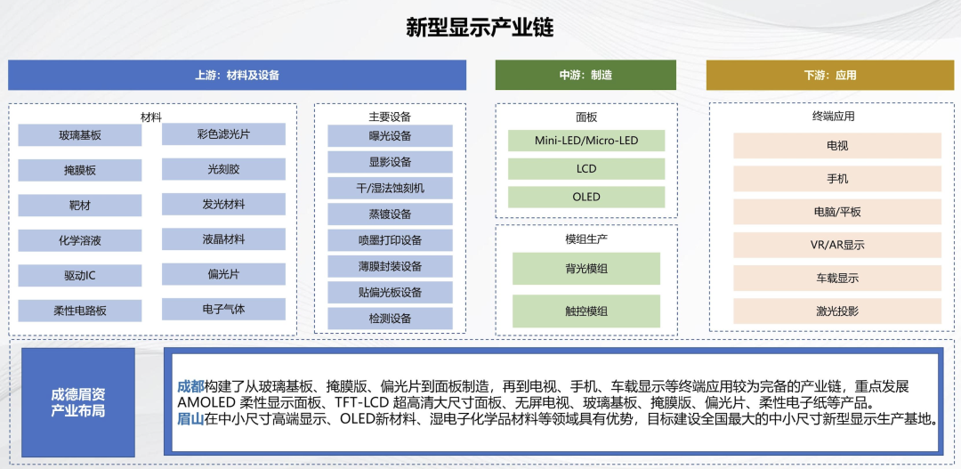 以成都为主导,绘制新型显示、轨道交通、航空装备、新能源汽车、绿色食品(调味品)、医美服务等6条产业链全景圈,分别以德阳、眉山、资阳为主导,绘制清洁能源装备、锂电、医疗器械(口腔医疗)3条产业链全景图,推动构建“相互依托、相互借力、相互融合”的产业链条。