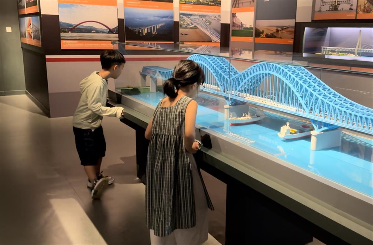 值得一提的是,该博物馆联合中铁大桥科技研究院研发了一款桥梁建造全过程移动滑轨屏。电子显示屏可随观众位置移动至对应沙盘位置,随后通过动画演示桥梁建设的具体过程,从桩基、承台、主塔的施工到上部结构施工,一一详尽展示。记者在现场看到,不少小朋友在家长的陪伴下推动滑轨屏,化身“工程师”,感受桥梁科学的魅力。
