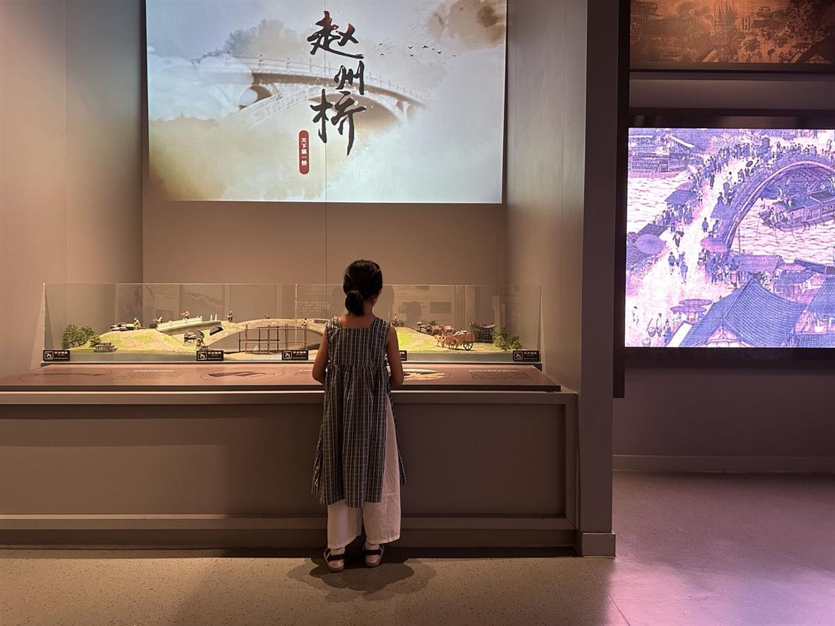 中国是世界上桥梁建造历史最悠久的国家之一。数千年来,中国劳动人民因地制宜,就地取材,建造了数不胜数、类型众多、构造别致的桥梁。步入中国古代桥梁展区,正在修建中的单孔赵州桥模型惟妙惟肖,映入眼帘;一墙之隔,《清明上河图》中的汴水虹桥被多媒体技术“还原”在屏幕上,只见千年前,河水汩汩,桥下渔火与夜市灯火交相辉映,桥上宋人从容穿行,穿越感扑面而来。