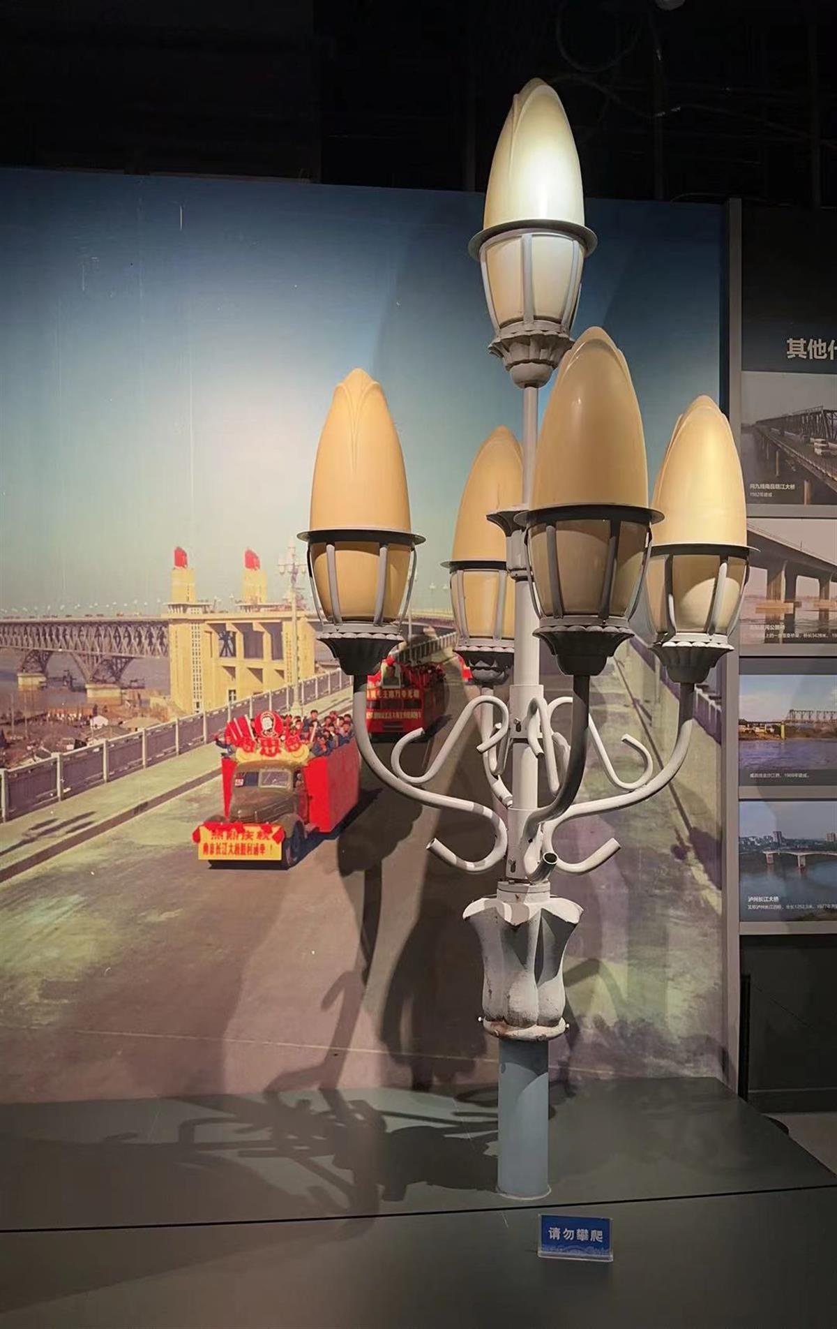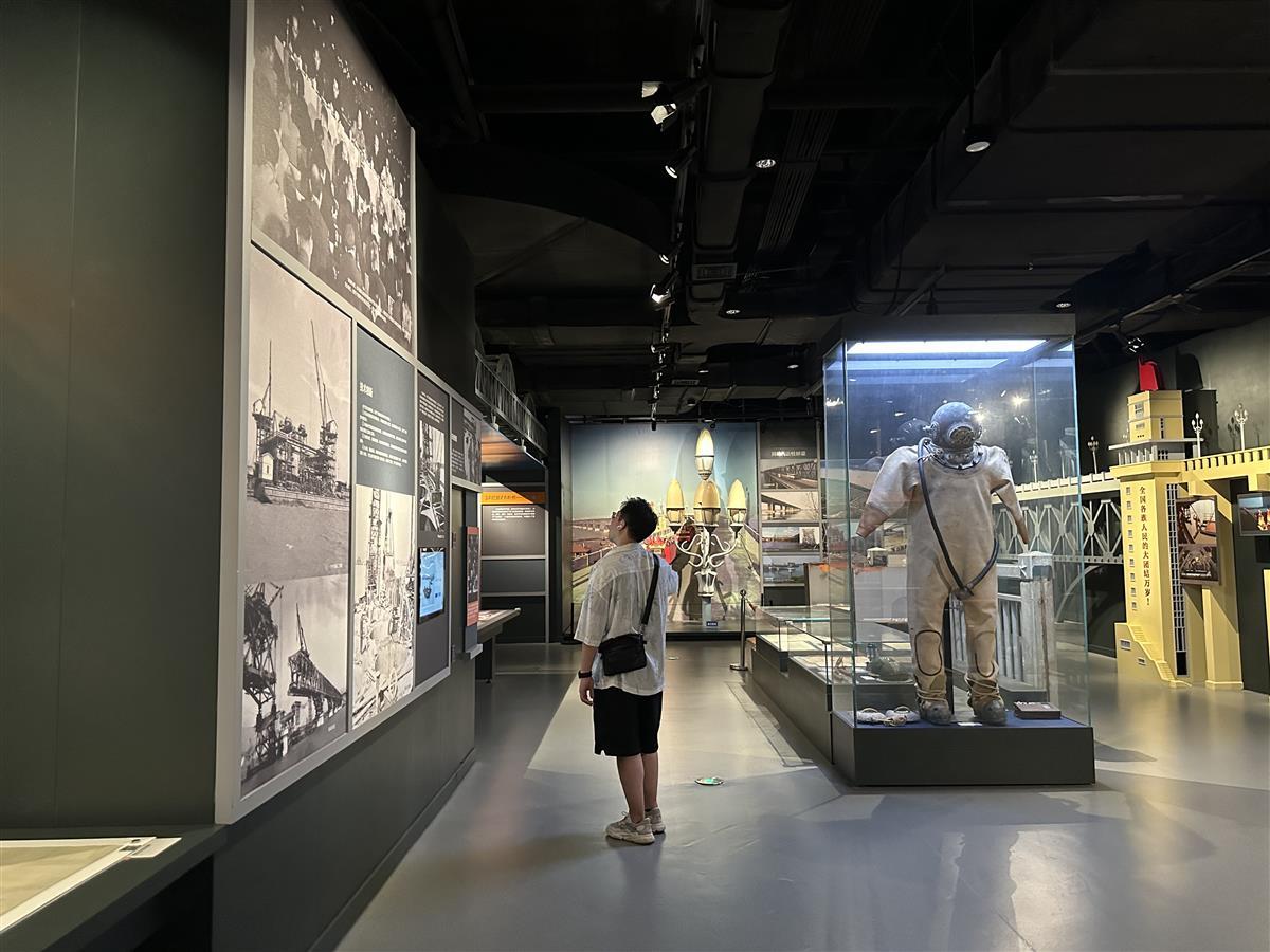 在近现代桥梁展区,武汉长江大桥模拟装置走廊让观众仿佛置身上世纪这座“万里长江第一桥”如火如荼的建设现场;展厅内,南京长江大桥的玉兰灯,又仿佛让人回到,书声琅琅的小学课堂:“正桥笔直的公路上,一对对玉兰花灯柱像等候检阅的队伍,站得整整齐齐。”不远处,被誉为“水下尖兵”的胡宝玲及战友们穿过的潜水服,诉述着世界桥梁史上的深潜神话。