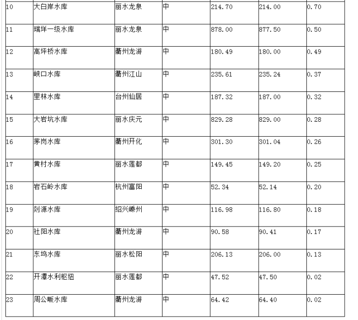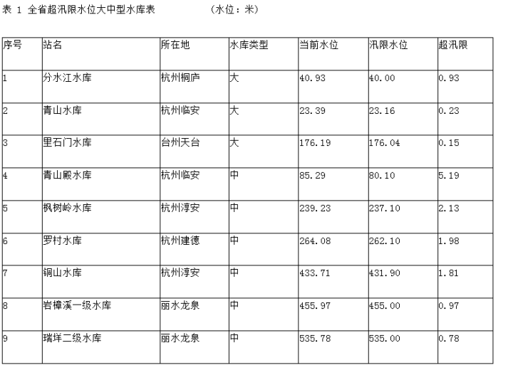 记者从浙江省水利厅获悉,截至今日7时,全省大中型水库超汛限水位有23座,其中大型水库3座,中型水库20座。详见表 1。