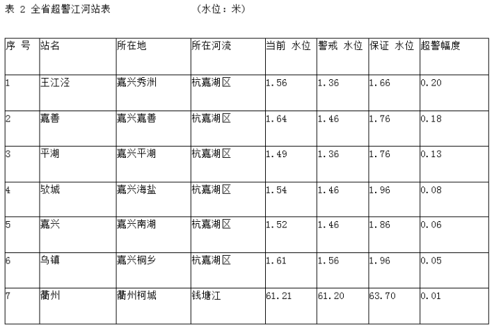 截至今日7时,主要江河站有7站超警,主要集中在杭嘉湖区,超警幅度均在0.20米以内。详见表2。