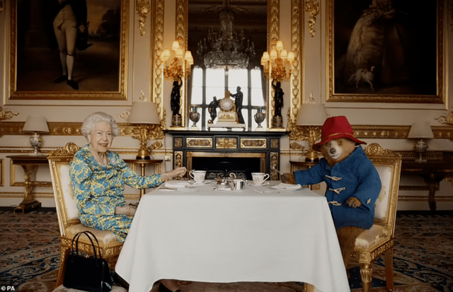 在这段短片中,女王跟另一位英国“国宝”喝了个庆典前的英式下午茶。而这位“国宝”,便是在英国家喻户晓的帕丁顿熊。值得一提的是,这只小熊在中国也颇有知名度,它的两部电影都曾引进中国。